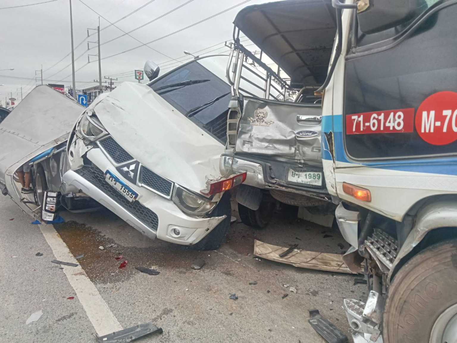 จากนั้นยังมีรถยนต์กระบะมิตซูบิชิ ทะเบียน กร-1555 ฉะเชิงเทรา พุ่งชนที่ด้านท้ายรถนักเรียนเป็นคันที่ 4 จนตัวรถหมุนกระเด็นด้านท้ายปลิวไปคร่อมอยู่บนตัวรถยนต์ไฟฟ้า BYD ทะเบียน 5ขส-5478 กรุงเทพฯ ที่ถูกแรงกระแทกพุ่งชนเข้ามาเป็นคันที่ 5 ส่วนด้านหน้าของรถยนต์คันที่ 4 ยังเกยทับอยู่บนหลังคาของรถสองแถวบรรทุกนักเรียนจนยุบแบนเกือบติดขอบกระบะ และมีรถยนต์กระบะฟอร์ดลักษณะเป็นรถสองแถวมีคอกหลังคาสูง ทะเบียน บร-1989 ฉะเชิงเทรา ถูกพุ่งชนเป็นคันที่ 6 เข้ามาอัดติดเบียดขนาบด้านข้างของรถคันที่ 4 และ 5 ที่เกยทับกันอยู่