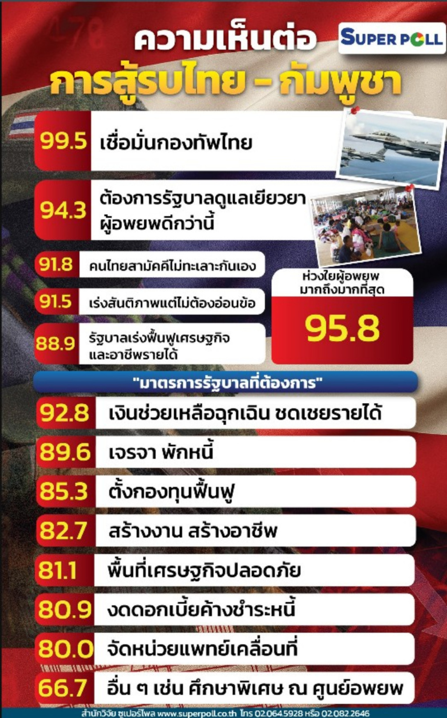 เมื่อสอบถามความคิดเห็นของประชาชนต่อการสู้รบไทย-กัมพูชา พบว่า เกือบร้อยละ 100 คือร้อยละ 99.5 เชื่อมั่นต่อกองทัพไทยจะปกป้องรักษาผืนแผ่นดินไทยได้ รองลงมาคือ ร้อยละ 94.3 ต้องการให้ฝ่ายการเมืองดูแลเยียวยาประชาชนผู้อพยพให้ดีกว่านี้ เช่น ค่าครองชีพ ภาระค่าใช้จ่าย หนี้สิน สวัสดิการ อาชีพการงาน สุขอนามัย เป็นต้น ร้อยละ 91.8 ต้องการเห็นคนไทยสามัคคี ไม่ทะเลาะกันเอง ร่วมแรงร่วมใจช่วยเหลือกัน ร้อยละ 91.5 ต้องการให้รัฐบาลเร่งเจรจาสันติภาพแต่ต้องไม่ยอมอ่อนข้อต่อผู้รุกราน ร้อยละ 88.9 ต้องการให้รัฐบาลเร่งฟื้นฟูเศรษฐกิจและอาชีพรายได้ของประชาชนหลังสงคราม