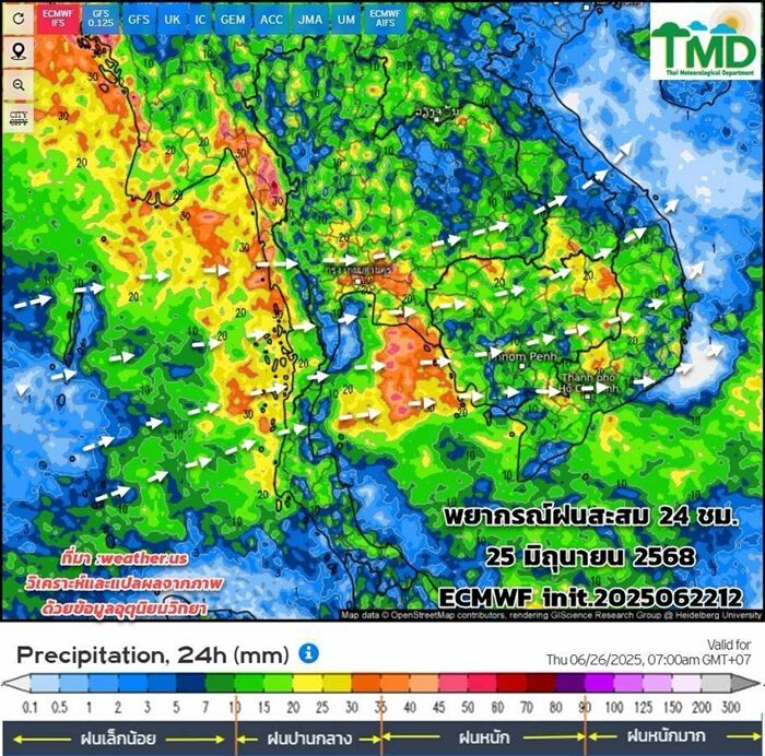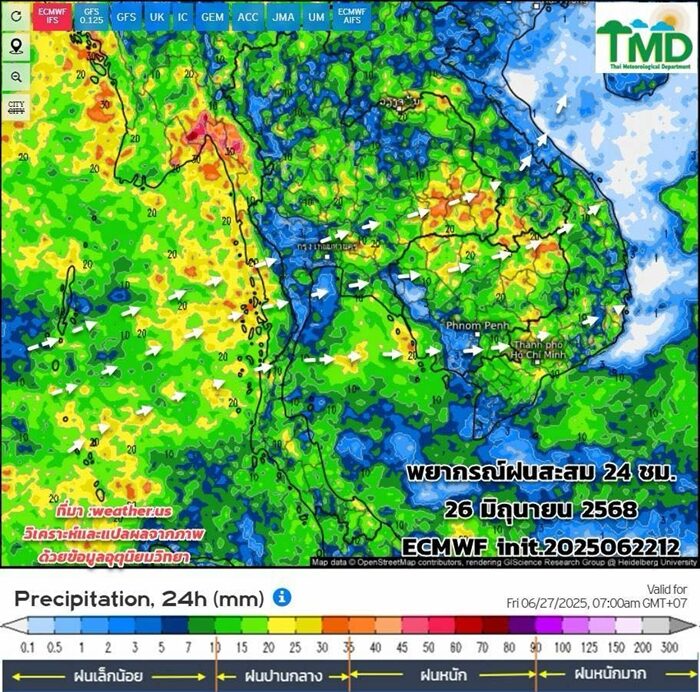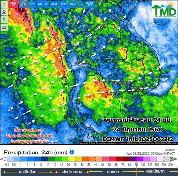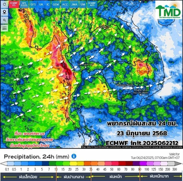 วันที่ 23 มิ.ย.2568 กรมอุตุนิยมวิทยา อัปเดตผลการพยากรณ์ฝนสะสมรายวัน (ทุกๆ 24 ชม.:(นับตั้งแต่เวลา 07.00 น. ถึงเวลา 07.00 น.วันรุ่งขึ้น) และลมที่ระดับ 925hPa (750 ม.) 13 วันล่วงหน้า ระหว่าง 23 มิ.ย.-5 ก.ค.68 init. 2025062212 จากศูนย์พยากรณ์อากาศระยะกลางยุโรป (ECMWF) วิเคราะห์ตามผลจากแบบจำลองฯ เฉดสีแดงหมายถึงฝนหนัก สีเขียวหมายถึงฝนเล็กน้อย :