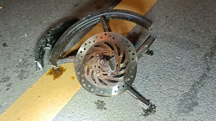 ที่เกิดเหตุลักษณะเป็นถนน 2 เลนสวนกันไปมา บริเวณกลางถนนพบรถจักรยานยนต์ ยี่ห้อฮอนด้า เวฟ ทะเบียน ฉะเชิงเทรา สภาพจอดคว่ำขวางถนนอยู่ บริเวณช่วงหน้ารถพังยับ เครื่องยนต์แตก ล้อหน้าหลุด แม็กซ์แตก ชิ้นส่วนกระจัดกระจายเต็มถนน