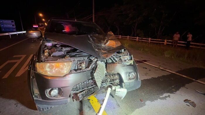 ถัดออกไปประมาณ 10 เมตร พบรถยนต์ ยี่ห้อมิตซูบิชิ ปาเจโร่ ทะเบียน กรุงเทพมหานคร สภาพจอดคร่อมเลนกลางถนน ด้านหน้ารถพังเสียหายยับเยิน ฝากระโปรงเปิด ส่วนด้านท้ายรถฝั่งซ้ายบนหลังคาพบคราบเลือดของผู้เสียชีวิตกระเซ็นอยู่พร้อมยางมัดผม