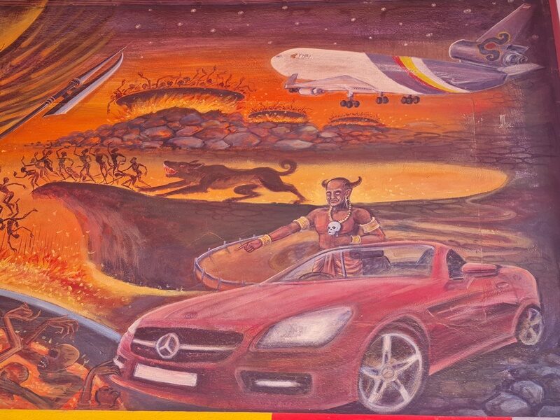 ภาพในเมรุแสดงยมทูตขับขี่ยานพาหนะต่าง ๆ เพื่อรับดวงวิญญาณ เช่น ยมทูตโกสต์ไรเดอร์ขี่ชอปเปอร์รับดวงวิญญาณที่ทำชั่วไปยังนรก และยมทูตขับรถเบนซ์รับดวงวิญญาณที่ทำความดีไปยังสวรรค์ ผู้บำเพ็ญเพียรยังได้รับการพาขึ้นเครื่องบินไปยังสวรรค์ชั้นสูง