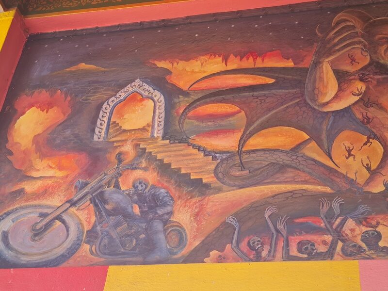 นครราชสีมา – วันที่ 7 ก.ค.2567 ที่วัดหนองจะบก ต.ในเมือง อ.เมือง จ.นครราชสีมา ทาสีเมรุเผาศพเป็นสีรุ้งสดใสทั้ง 7 สี พร้อมตกแต่งภายในเมรุด้วยภาพวาดบรรยากาศนรกสวรรค์ มียมบาลและยมทูตกำลังพิจารณาผลกรรมของผู้เสียชีวิตเพื่อส่งดวงวิญญาณไปยังปรโลก
