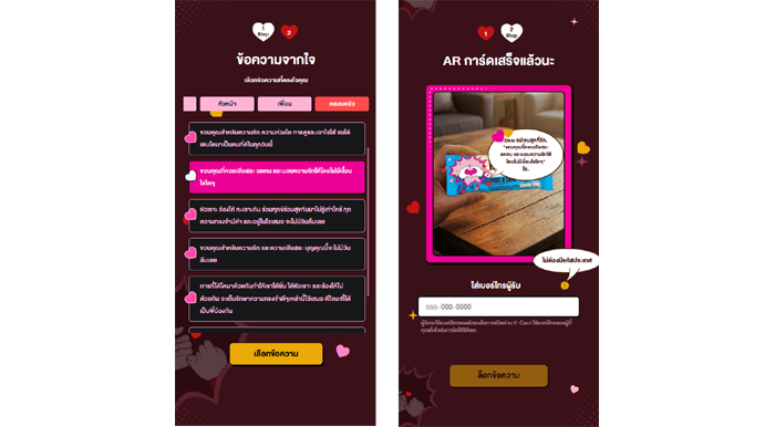 • ข้อความ AR แบบอินเทอร์แอคทีฟเต็มอรรถรส: เติมเสน่ห์แห่งเวทมนตร์ดิจิทัลด้วยฟีเจอร์ Augmented Reality (AR) ที่เปิดโอกาสให้ผู้ส่งเลือกข้อความสำเร็จรูปที่เปี่ยมด้วยความหมายจากใจโดยผู้รับ เพียงสแกนช็อกโกแลตแท่งจริงด้วยสมาร์ตโฟน ก็จะได้สัมผัสประสบการณ์เสมือนจริงที่ทั้งสร้างความประทับใจและแชร์ต่อได้