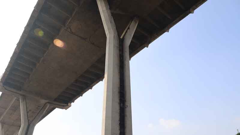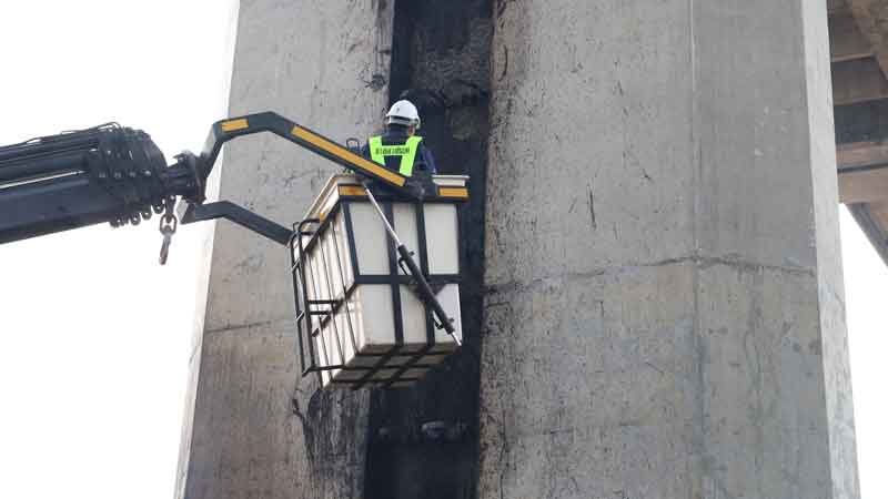 จากการตรวจสอบเบื้องต้น พบว่ามี คอนกรีตบริเวณโคนเสากะเทาะออกมาบางส่วน (ลึกไม่เกิน 1 เซนติเมตร) ทีมวิศวกรได้ตรวจสอบ กำลังอัดของคอนกรีต พบว่ายังอยู่ในค่าที่ออกแบบไว้ สภาพโครงสร้างยังคงปกติและปลอดภัย ประชาชนสามารถเชื่อมั่นได้ว่าโครงสร้างสะพานยังรับน้ำหนักและสัญจรได้ตามปกติ