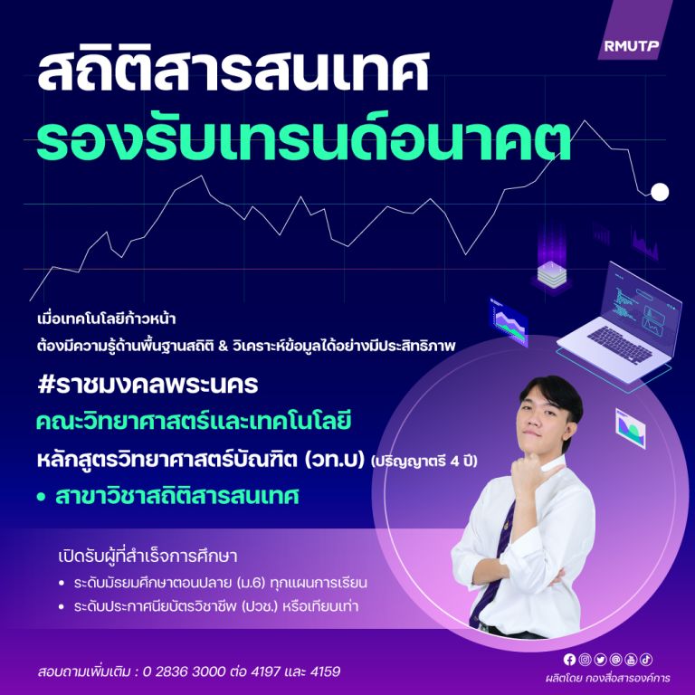 ทั้งนี้มหาวิทยาลัยมีความพร้อมทางกายภาพ และความพร้อมด้านอุปกรณ์ เครื่องมือการเรียนการสอน การบริการเทคโนโลยีสารสนเทศ คอมพิวเตอร์ Wi-Fi และอื่น ๆ ที่เพียงพอ สำหรับการสนับสนุนให้นักศึกษาเรียนรู้ได้อย่างมีประสิทธิภาพ โดยกำลังเปิดรับสมัครนักศึกษาใหม่ประจำปีการศึกษา 2566 รับตรง รอบที่1 และโควตา รอบที่ 2 สำหรับผู้สมัครใช้วุฒิ ปวช.-ปวส. ยื่นใบสมัครได้ตั้งแต่บัดนี้ – 22 กุมภาพันธ์ 2566 ผ่านทางเว็บไซต์ http://www.rmutp.ac.th ผู้สนใจดูรายละเอียดเพิ่มเติมที่ https://reg.rmutp.ac.th/registrar สอบถามข้อมูลที่ สาขาวิชาสถิติสารสนเทศโทรศัพท์ 0 2836 3000 ต่อ 4197 หรืองานหลักสูตร โทรศัพท์ 0 2836 3000 ต่อ 4159 หรือที่ E-mail : sci.rmutp@rmutp.ac.th
