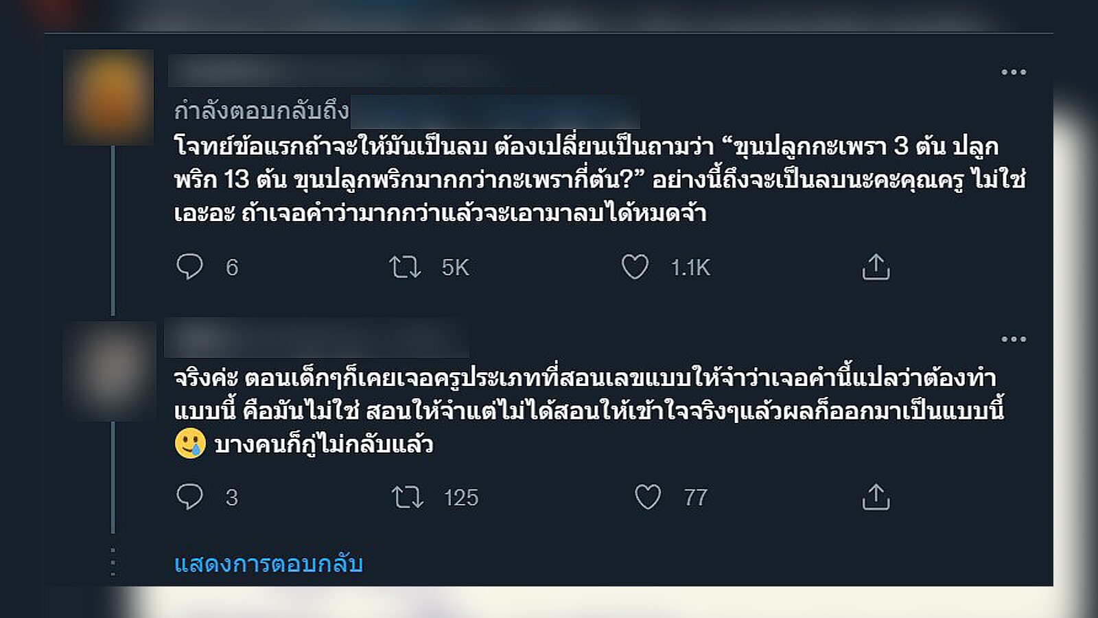 โดยโจทย์ถามว่า"ขุนปลูกกะเพรา 3 ต้น ปลูกพริกมากกว่ากะเพรา 13 ต้น ขุนปลูกพริกกี่ต้น" ซึ่งนักเรียนได้ตอบว่า"13+3=16 ต้น" แต่คุณครูบอกว่าผิด พร้อมเฉลยว่า คำตอบคือ"10 ต้น"