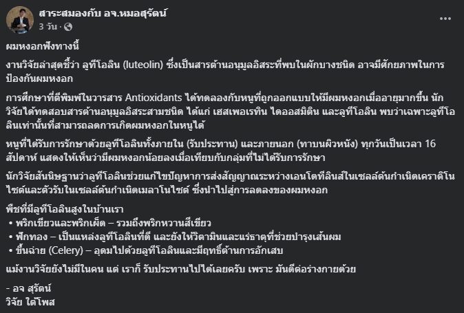 อ่านข่าวต้นฉบับได้ที่ : ผมหงอกฟังทางนี้! “หมอสุรัตน์” เผยสาร 'ลูทีโอลิน' ในผักบางชนิดช่วยป้องกันได้