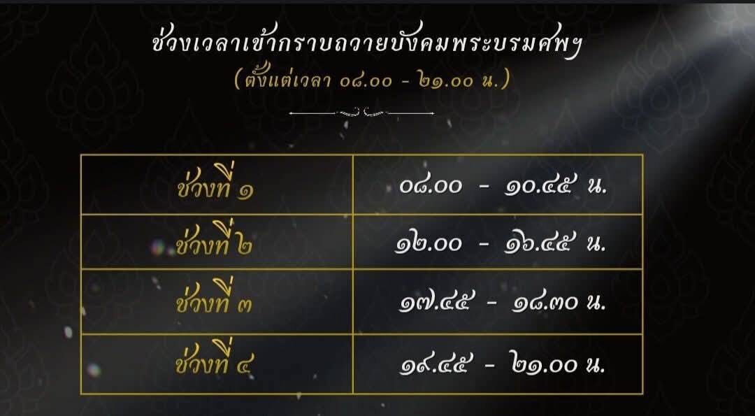 สำนักพระราชวังกำหนดให้ประชาชนสามารถเข้าถวายสักการะพระบรมศพ ใน 4 ช่วงเวลา ดังนั้น ช่วงที่1 เวลา 08.00 น.-10.45 น. ช่วงที่ 2 เวลา 12.00 น.-16.45 น. ช่วงที่3 เวลา 17.45 น.-18.30 น. และช่วงที่ 4 เวลา 19.45 น.-21.00 น.