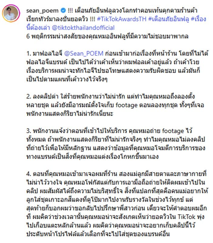 “1. มาฟอลไอจี @Sean_POEM ก่อนเข้ามาก่อเรื่องที่หน้าร้าน โดยที่ไม่ได้ฟอลไอจีแบรนด์ เป็นไปได้ว่าเค้าเห็นว่าผมฟอลเค้าอยู่แล้ว ถ้าเค้าโวยเรื่องบริการผมน่าจะทักไอจีไปขอโทษแสดงความรับผิดชอบ แล้วมันก็เป็นไปตามแผนที่เค้าวางไว้จริงๆ”