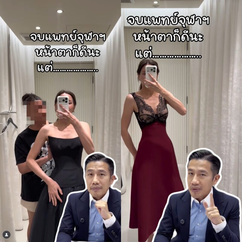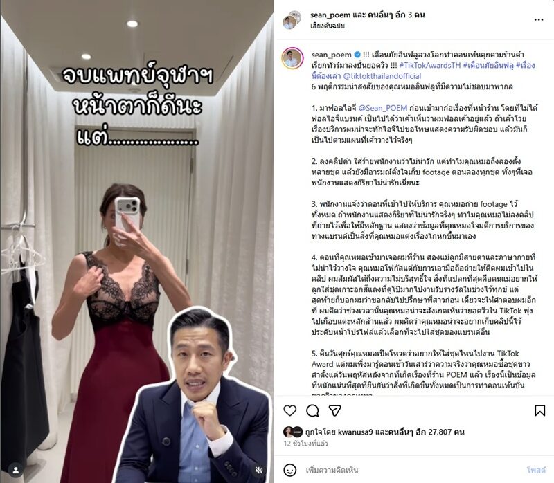 “4. ตอนที่คุณหมอเข้ามาเจอผมที่ร้าน สองแม่ลูกมีสายตาและภาษากายที่ไม่น่าไว้วางใจ คุณหมอโฟกัสแต่กับการเอามือถือถ่ายให้ติดผมเข้าไปในคลิป ผมสัมผัสได้ถึงความไม่บริสุทธิ์ใจ สิ่งที่แปลกที่สุดคือคนแม่อยากให้ลูกใส่ชุดเกาะอกสีแดงที่ดูโป๊มากไปงานรับรางวัลในช่วงไว้ทุกข์ แต่สุดท้ายก็บอกผมว่าขอกลับไปปรึกษาพี่สาวก่อน เดี๋ยวจะให้คำตอบผมอีกที ผมคิดว่าช่วงเวลานั้นคุณหมอน่าจะสังเกตเห็นว่ายอดวิวใน TikTok พุ่งไปเกือบแตะหลักล้านแล้ว ผมคิดว่าคุณหมอน่าจะอยากเก็บคลิปนี้ไว้ประดับหน้าโปรไฟล์แล้วเลือกที่จะไปใส่ชุดของแบรนด์อื่น”