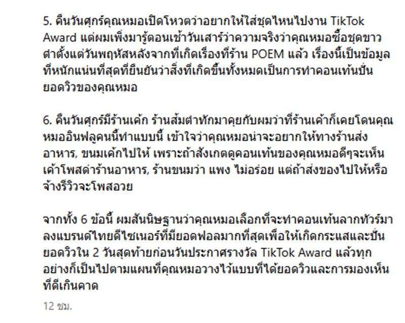 “5. คืนวันศุกร์คุณหมอเปิดโหวตว่าอยากให้ใส่ชุดไหนไปงาน TikTok Award แต่ผมเพิ่งมารู้ตอนเช้าวันเสาร์ว่าความจริงว่าคุณหมอซื้อชุดขาวดำตั้งแต่วันพฤหัสหลังจากที่เกิดเรื่องที่ร้าน POEM แล้ว เรื่องนี้เป็นข้อมูลที่หนักแน่นที่สุดที่ยืนยันว่าสิ่งที่เกิดขึ้นทั้งหมดเป็นการทำคอนเทนต์ปั่นยอดวิวของคุณหมอ”
