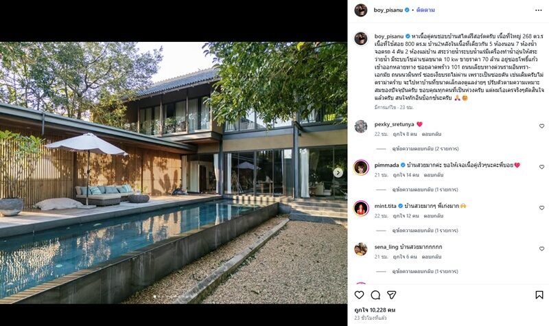 หลังจาก บอย ภิษณุ ตัดสินใจประกาศขายบ้านหลังใหญ่สุดหรูไปก่อนหน้านี้ ท่ามกลางเสียงวิพากษ์วิจารณ์ต่างๆ นานา ล่าสุด หนุ่มบอยโพสต์ภาพบ้านในมุมต่างๆ พร้อมแคปชั่นย้ำประกาศขายบ้าน พร้อมตามหาเนื้อคู่คนชอบบ้านสไตล์รีสอร์ตด้วยว่า