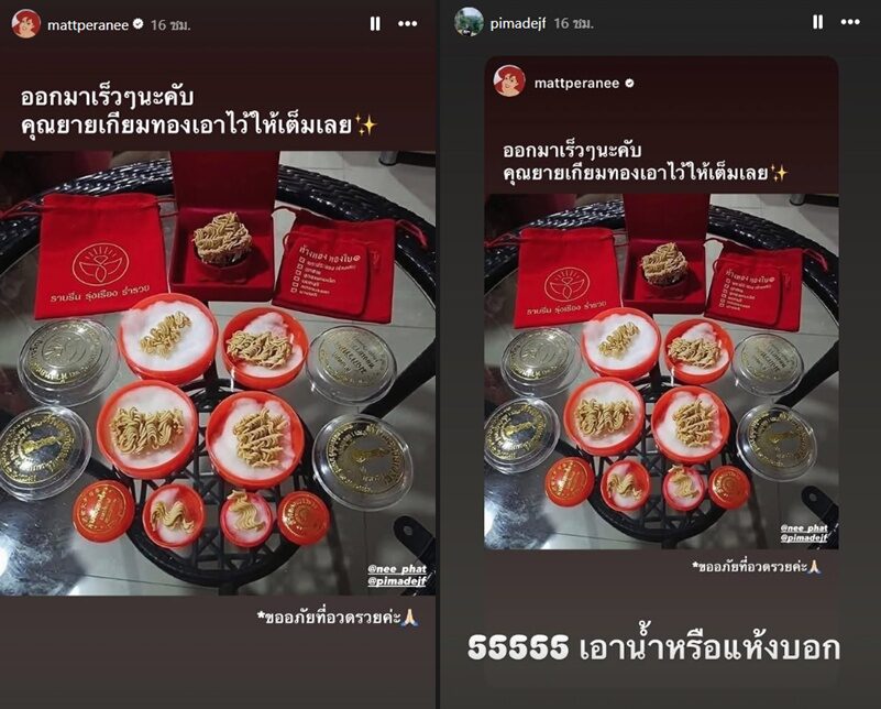 ล่าสุดสาวแมทโพสต์ภาพตลับใส่ทองถุงทองกองเต็มโต๊ะ ข้อความติดตลกว่า“ออกมาเร็วๆนะคับ คุณยายเกียมทองเอาไว้ให้เต็มเลย ขออภัยที่อวดรวยค่ะ”