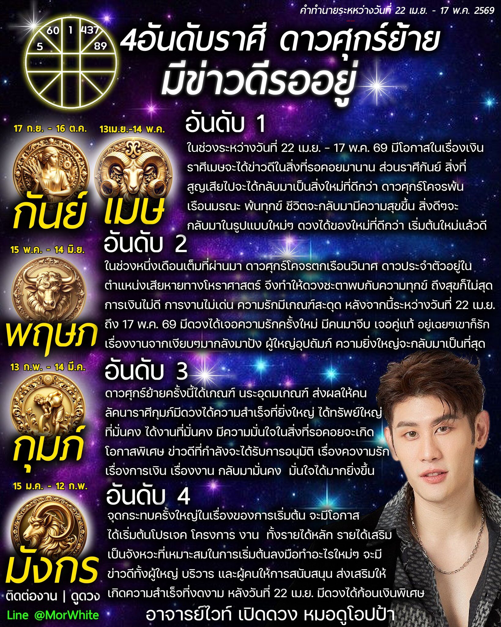 ในช่วงระหว่างวันที่ 22 เม.ย.-17 พ.ค.69 มีโอกาสในเรื่องเงิน ราศีเมษจะได้ข่าวดีในสิ่งที่รอคอยมานาน ส่วนราศีกันย์ สิ่งที่สูญเสียไปจะได้กลับมาเป็นสิ่งใหม่ที่ดีกว่า ดาวศุกร์โคจรพ้นเรือนมรณะ พ้นทุกข์ ชีวิตจะกลับมามีความสุขขึ้น สิ่งดี ๆ จะกลับมาในรูปแบบใหม่ ๆ ดวงได้ของใหม่ที่ดีกว่า เริ่มต้นใหม่แล้วดี