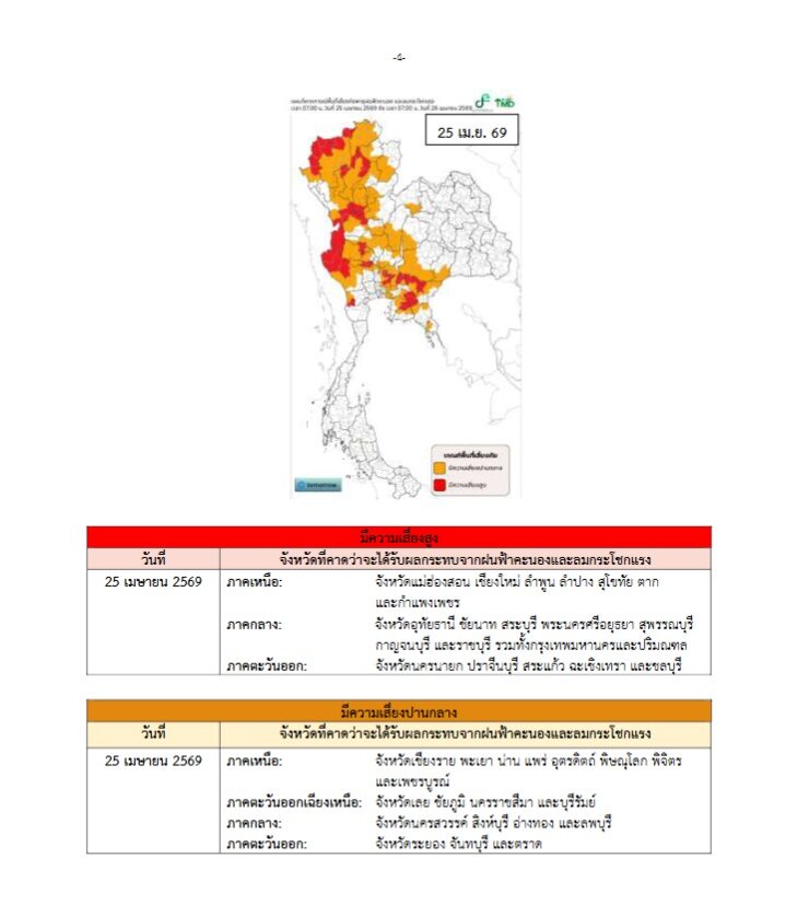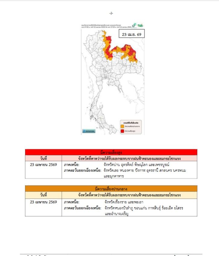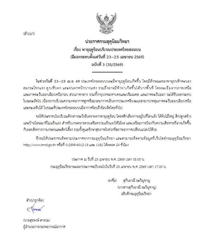 เวลา 05.00 น. กรมอุตุนิยมวิทยา ประกาศเรื่อง พายุฤดูร้อนบริเวณประเทศไทยตอนบน (มีผลกระทบตั้งแต่วันที่ 23–25 เมษายน 2569) ฉบับที่ 3 (35/2569)ความว่า ช่วงวันที่ 23–25 เม.ย. 69ประเทศไทยตอนบนจะมีพายุฤดูร้อนเกิดขึ้น โดยมีลักษณะของพายุฝนฟ้าคะนอง ลมกระโชกแรง ลูกเห็บตก และฝนตกหนักบางแห่ง รวมถึงอาจมีฟ้าผ่าเกิดขึ้นได้บางพื้นที่ โดยจะเริ่มจากภาคเหนือ และภาคตะวันออกเฉียงเหนือก่อน ส่วนภาคกลาง รวมทั้งกรุงเทพมหานครและปริมณฑล และภาคตะวันออก จะได้รับผลกระทบในระยะถัดไป