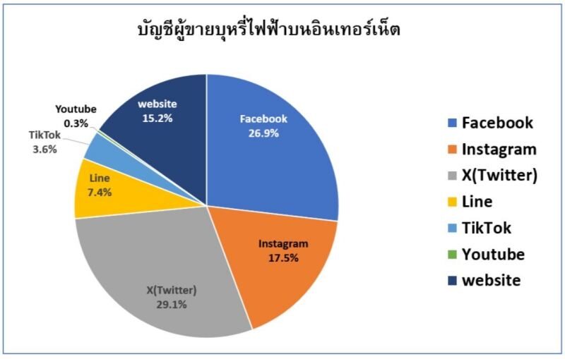 จากรายงานการเฝ้าระวังการตลาดบุหรี่ไฟฟ้าในสื่อออนไลน์ช่วงม.ค.-ก.พ. ปี2567 โดย น.ส.กนิษฐา ไทยกล้า พบว่า มีผู้ฝ่าฝืนกฎหมายลักลอบขายบุหรี่ไฟฟ้าในสื่อออนไลน์จำนวนมากถึง309 บัญชีรายชื่อ มีการโพสต์605 ครั้ง ส่วนใหญ่66.7% เป็นผู้ขายรายเก่าที่ใช้แพลตฟอร์มออนไลน์มาก่อนปี2567 รองมาคือ33% เป็นผู้ขายรายใหม่ที่ลงทะเบียนใช้แพลตฟอร์มออนไลน์ปี2567