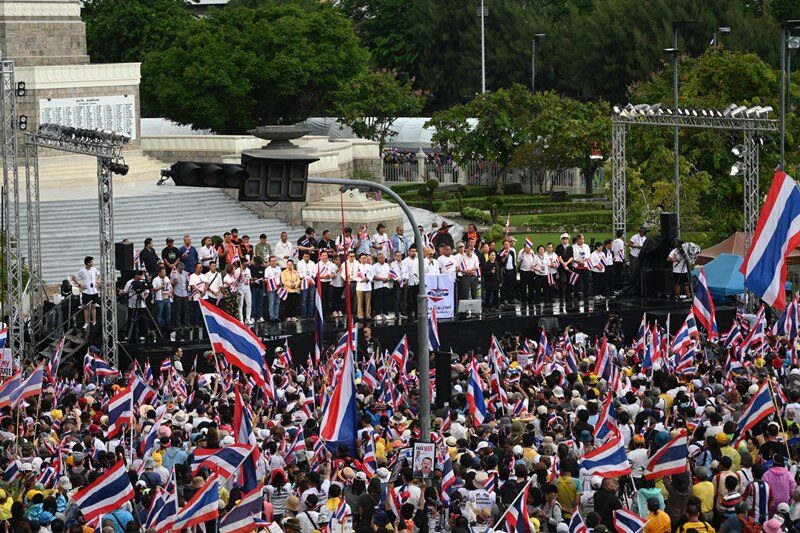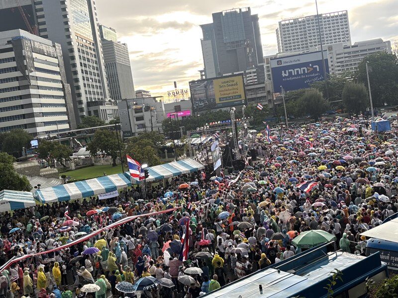 วันที่ 28 มิ.ย 68 ที่อนุสาวรีย์ชัยสมรภูมิ มีผู้ชุมนุมจากกลุ่ม “รวมพลังแผ่นดินปกป้องอธิปไตย” ยังคงปักหลักต่อเนื่องแม้มีฝนตกช่วงบ่าย โดยทยอยเดินทางเข้าพื้นที่จนแน่นขนัดรอบวงเวียน รวมถึงเกาะกลางและสะพานลอย