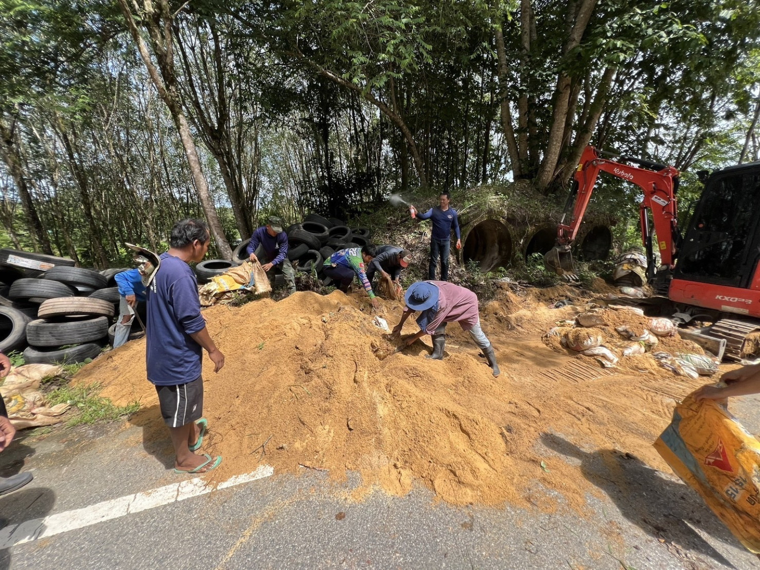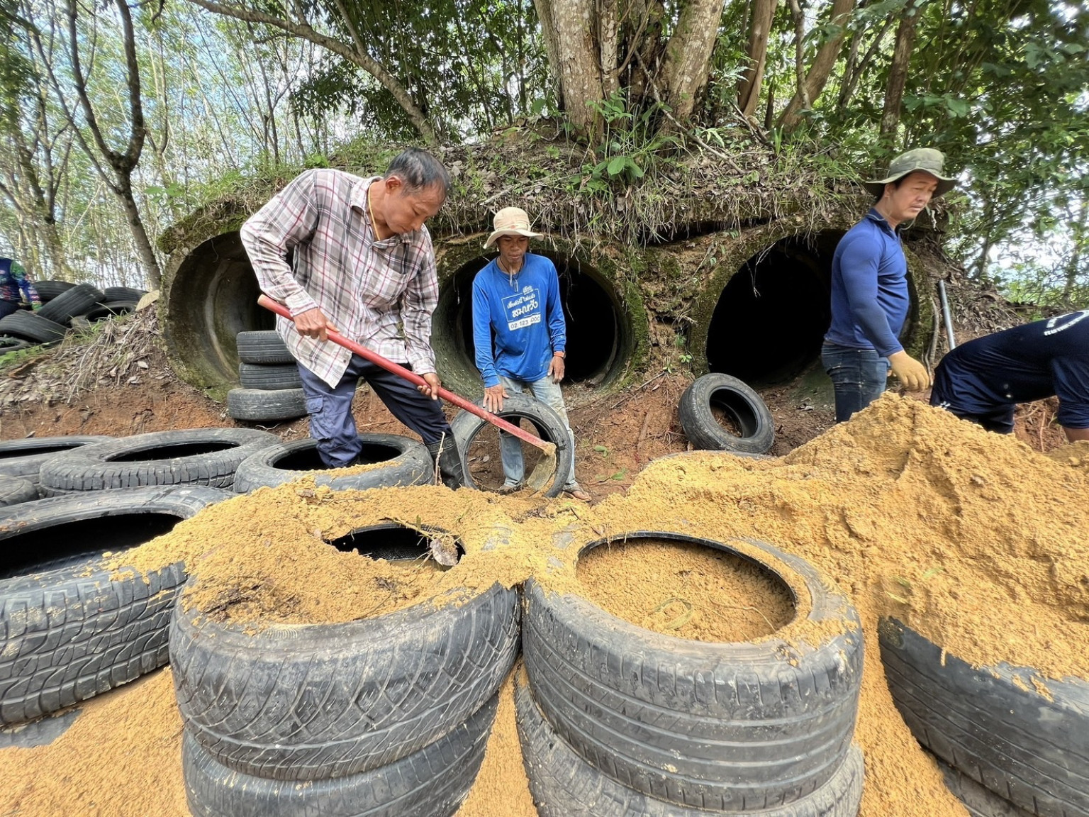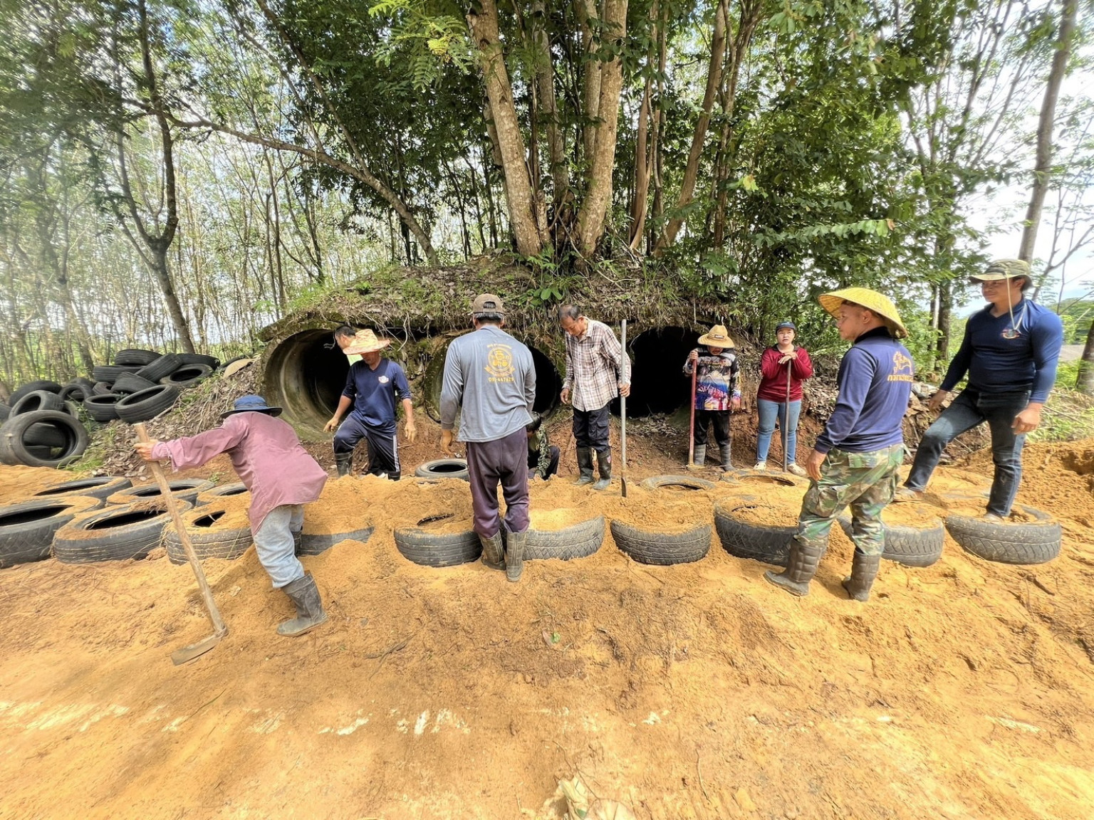 เจ้าหน้าที่และชาวบ้านซ่อมหลุมหลบภัยสมัยเขมรแดงเตรียมรับสถานการณ์พร้อมธารน้ำใจมอบยางล้อรถยนต์ทำบังเกอร์