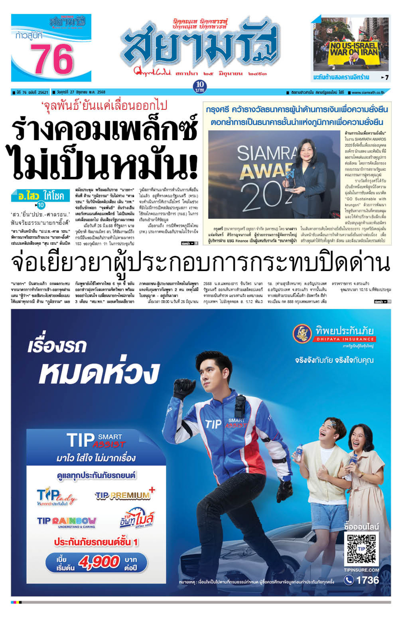หน้า 1 หนังสือพิมพ์สยามรัฐรายวัน ฉบับวันที่ 27/06/68
