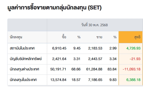 โดยวันนี้ (30 พ.ค.68) ตลาดหุ้นไทยปิดที่ระดับ 1,149.18 จุด ลดลง -14.83 จุด (-1.27%) มูลค่าซื้อขาย 73,098.63 ล้านบาท