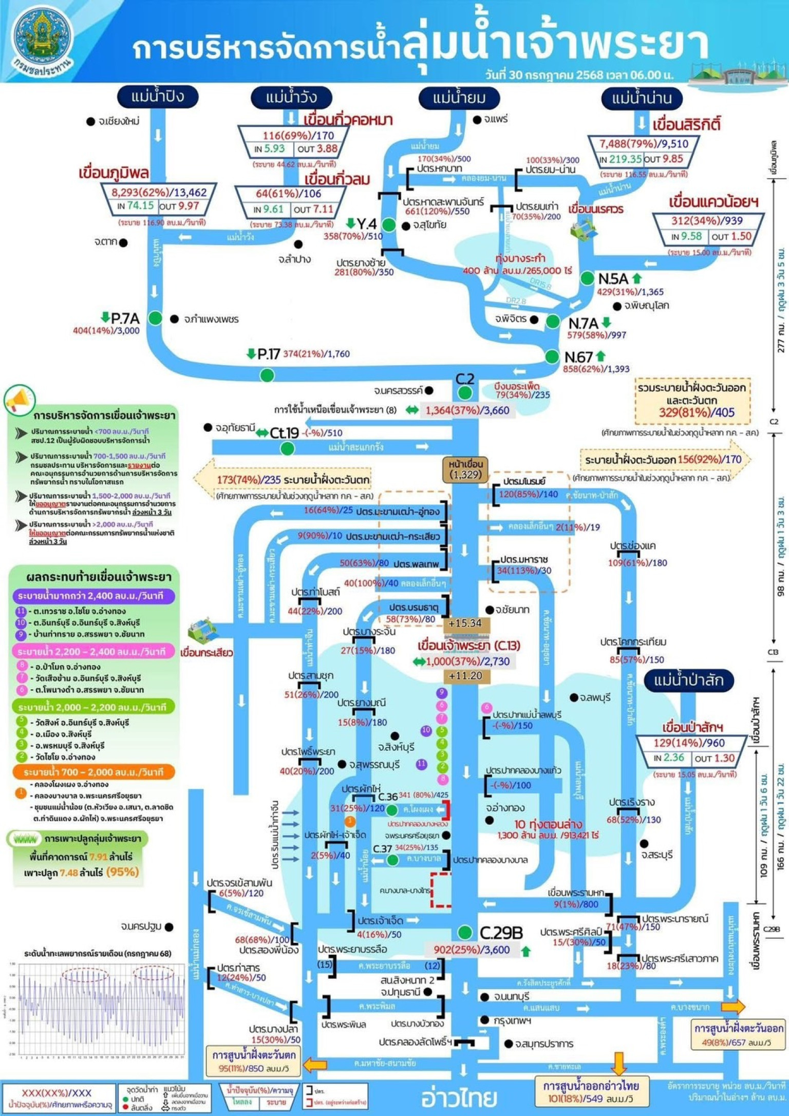 • กรมชลประทานทยอยปรับการระบายน้ำเพิ่มขึ้นเป็น 1,050 ลบ.ม./วินาที ภายใน เวลา 18.00 น. ของวันนี้ (30 ก.ค. 68) เพื่อให้สอดคล้องกับปริมาณน้ำจากทางตอนบน และลดผลกระทบต่อพื้นที่ด้านท้าย