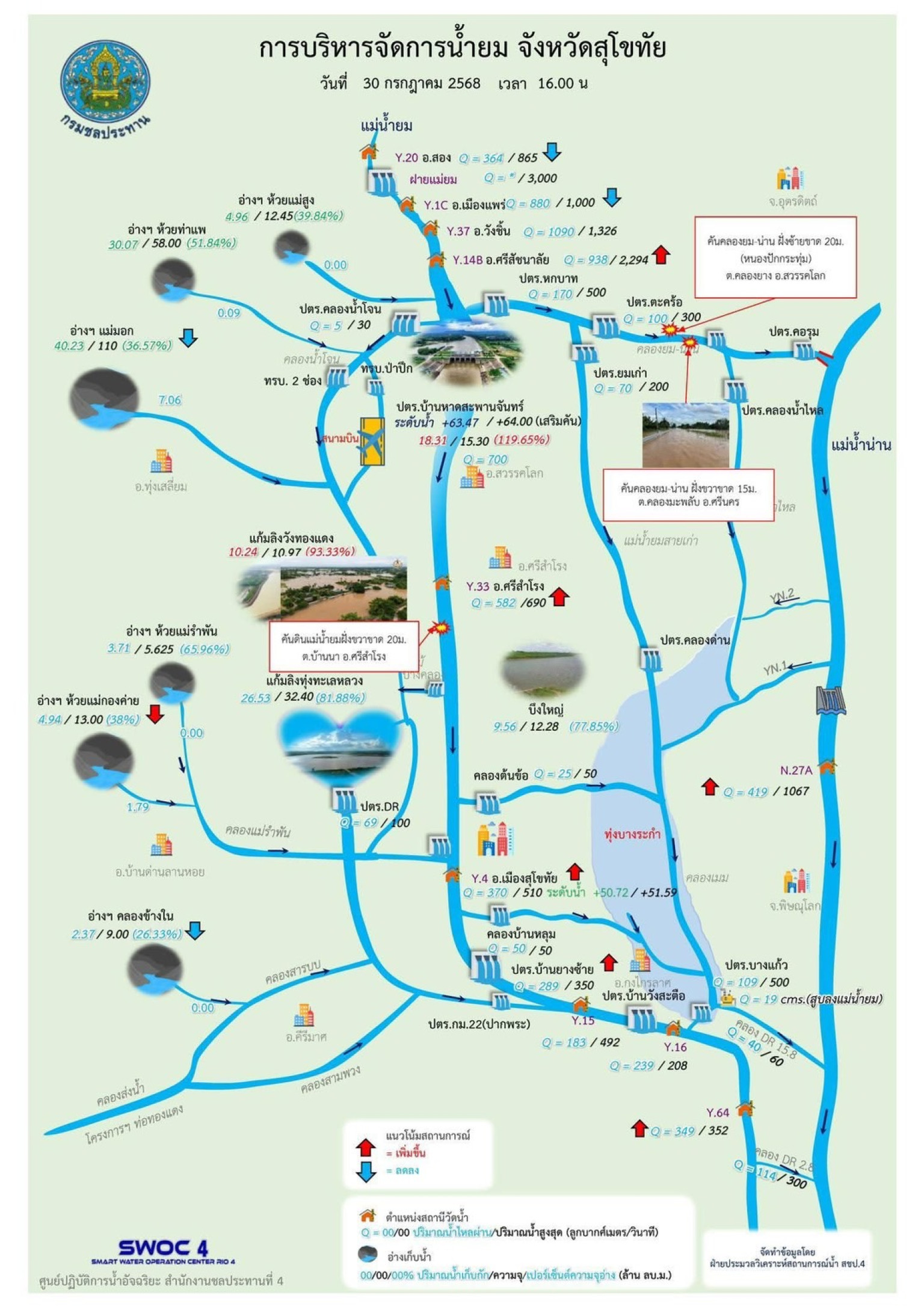 • ระดับน้ำ 9.69 ม. (สูงกว่าตลิ่ง 3.19 ม.) แนวโน้ม ลดลง