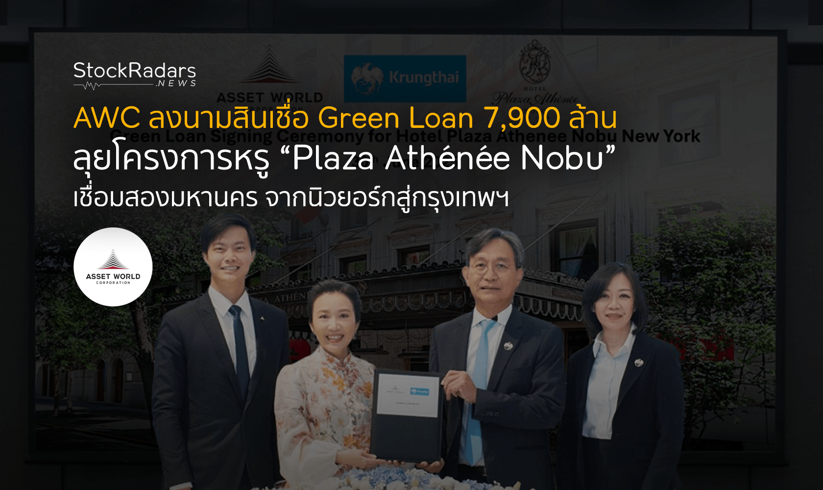 AWC จับมือธนาคารกรุงไทย ลงนามสัญญาสินเชื่อระยะยาวประเภท Green Loan มูลค่า 7,904 ล้านบาท (ราว 208 ล้านดอลลาร์สหรัฐ) เพื่อสนับสนุนโครงการโรงแรมระดับอัลตร้าลักชัวรี “Hotel Plaza Athénée Nobu New York” ใจกลางมหานครนิวยอร์ก สอดคล้องกับวิสัยทัศน์ร่วมด้านความยั่งยืนและการยกระดับประเทศไทยสู่จุดหมายปลายทางท่องเที่ยวยั่งยืนระดับโลก โดยโครงการนี้จะเชื่อมโยงกับโรงแรม “Plaza Athénée Nobu Bangkok” เสริมพอร์ตการลงทุนของ AWC พร้อมยกระดับประสบการณ์ท่องเที่ยวสุดหรูจากนิวยอร์กสู่กรุงเทพฯ