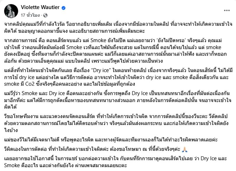 ขอโทษทีมงานแวดวงคนจัดคอนเสิร์ต วี วิโอเลต เผยผิดเองในการตัดต่อปมคลิปคุณแม่ทำคนเข้าใจผิด แชร์ข้อมูล Dry Ice - Smoke ต่างกันยังไง