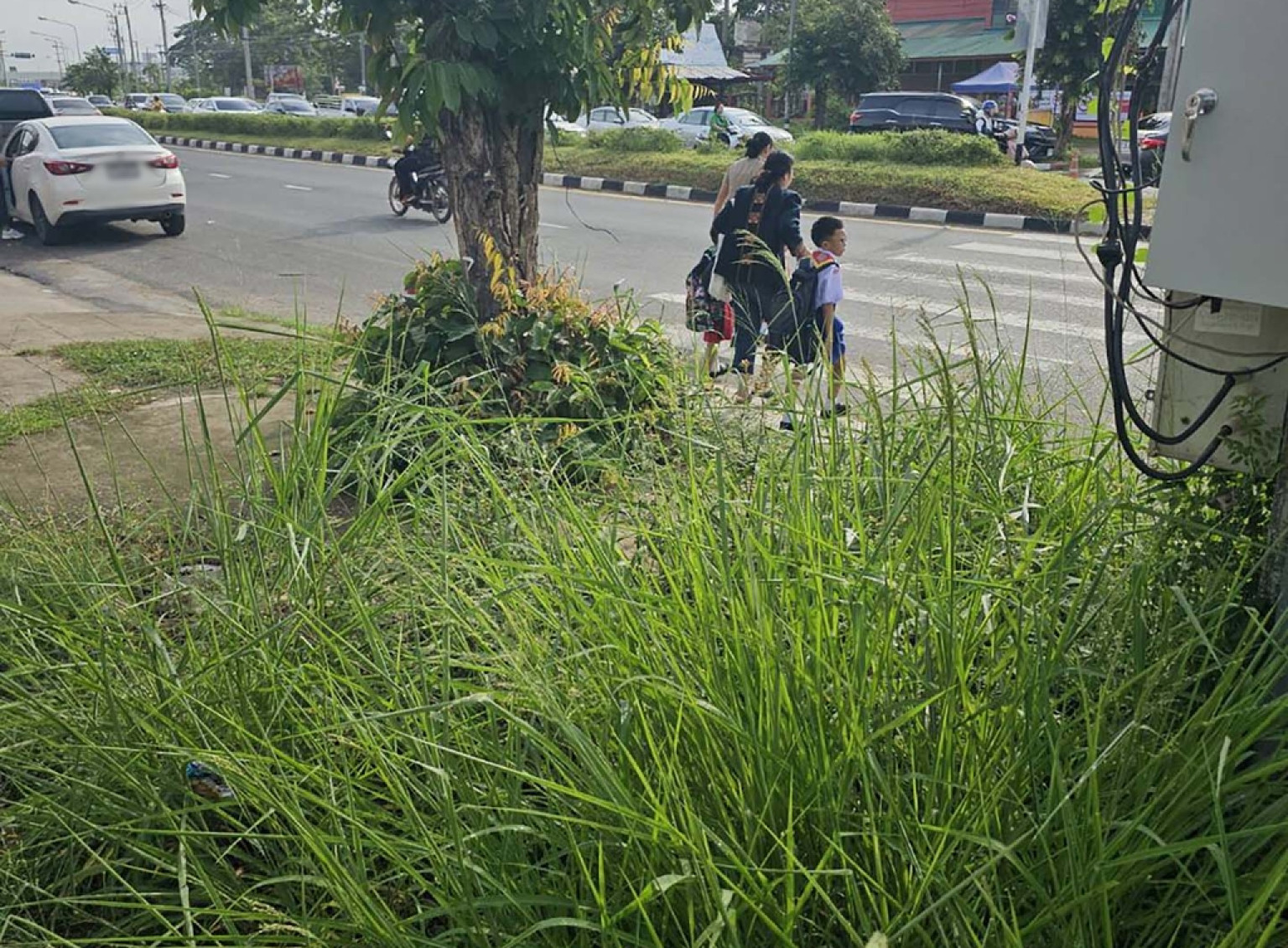 ซึ่งตอนนี้เป็นฤดูฝน มีต้นไม้และต้นหญ้า ขึ้นปกคลุมทั่วบริเวณ ทำให้ผู้ปกครอง และลูกหลานไม่มีที่ยืนรอข้ามทางม้าลาย ต้องเลี่ยงมายืนบนผิวการจราจรบนถนน เป็นอันตรายและเสี่ยงต่อเกิดอุบัติเหตุ