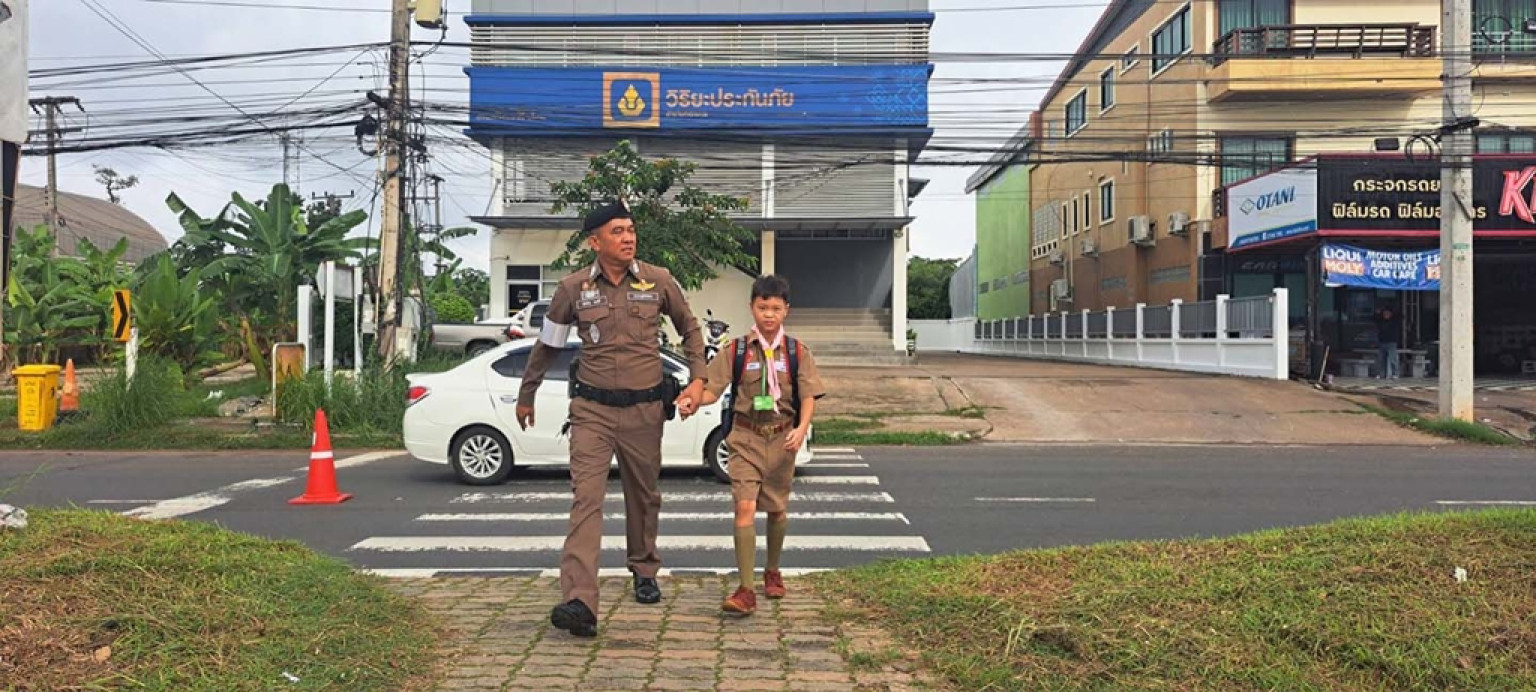 งานจราจร สภ.เมืองมุกดาหาร ตัดหญ้ากำจัดวัชพืชบนฟุตบาตทางเท้าบริเวณทางข้ามเพื่อความปลอดภัย