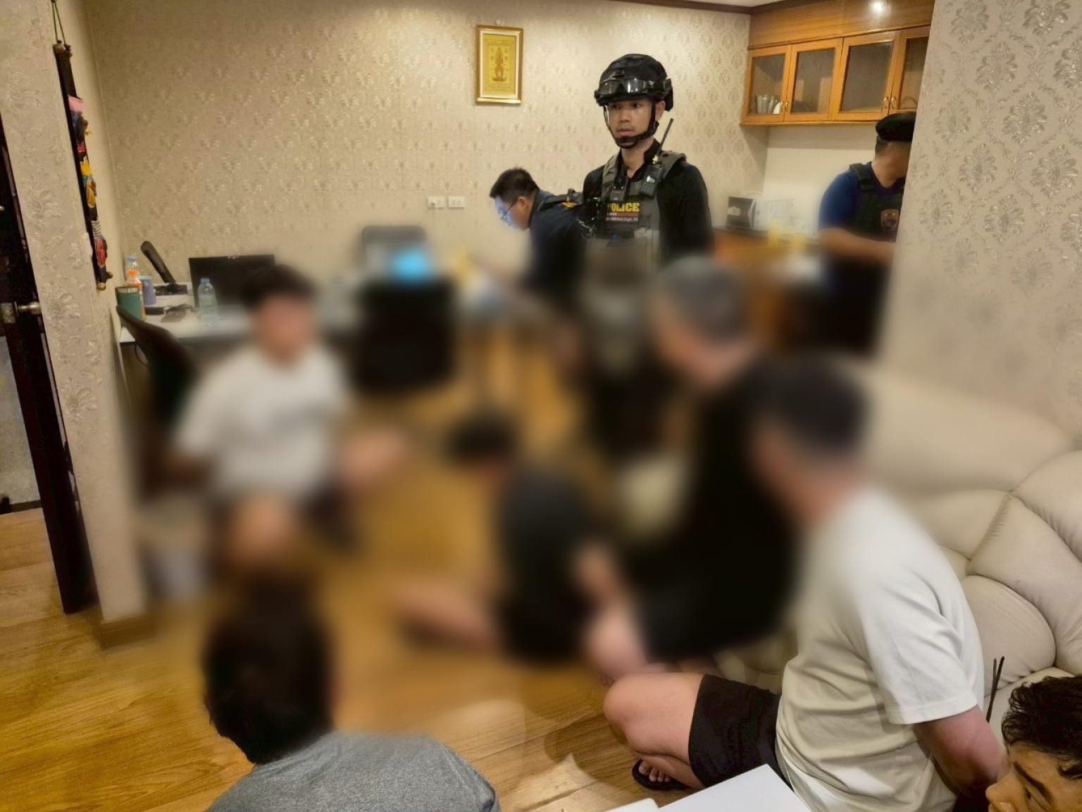 และบนชั้น 8 เป็นส่วนที่มีคนจีนจำนวน 6 คน นั่งทำงานออนไลน์ตรวจพบข้อมูลในคอมพิวเตอร์ ว่าทำงานเป็นพนักงานลอกส่งลิงค์ให้บริษัทเอกชนในจีนกดเพื่อปล่อย ransomware จึงได้จับกุมในความผิดฐาน “เป็นสมาชิกของคณะบุคคลซึ่งปกปิดวิธีดำเนินการและมีความมุ่งหมายเพื่อการอันมิชอบด้วยกฎหมาย (เป็นอั้งยี้) และเป็นบุคคลต่างด้าวทำงานโดยไม่ได้รับอนุญาต” พร้อมด้วยเครื่องคอมพิวเตอร์โน้ตบุ๊ค จำนวน 9 เครื่อง โทรศัพท์มือถือจำนวน 15 เครื่อง