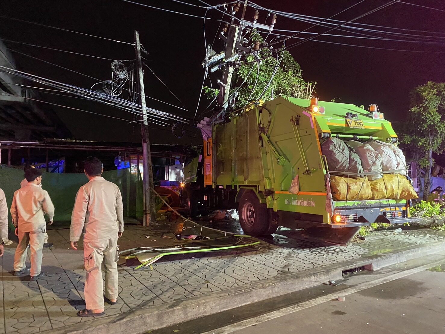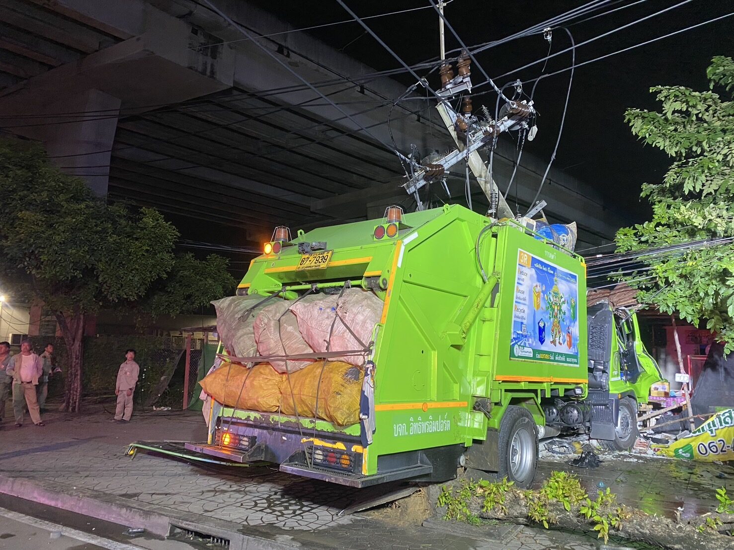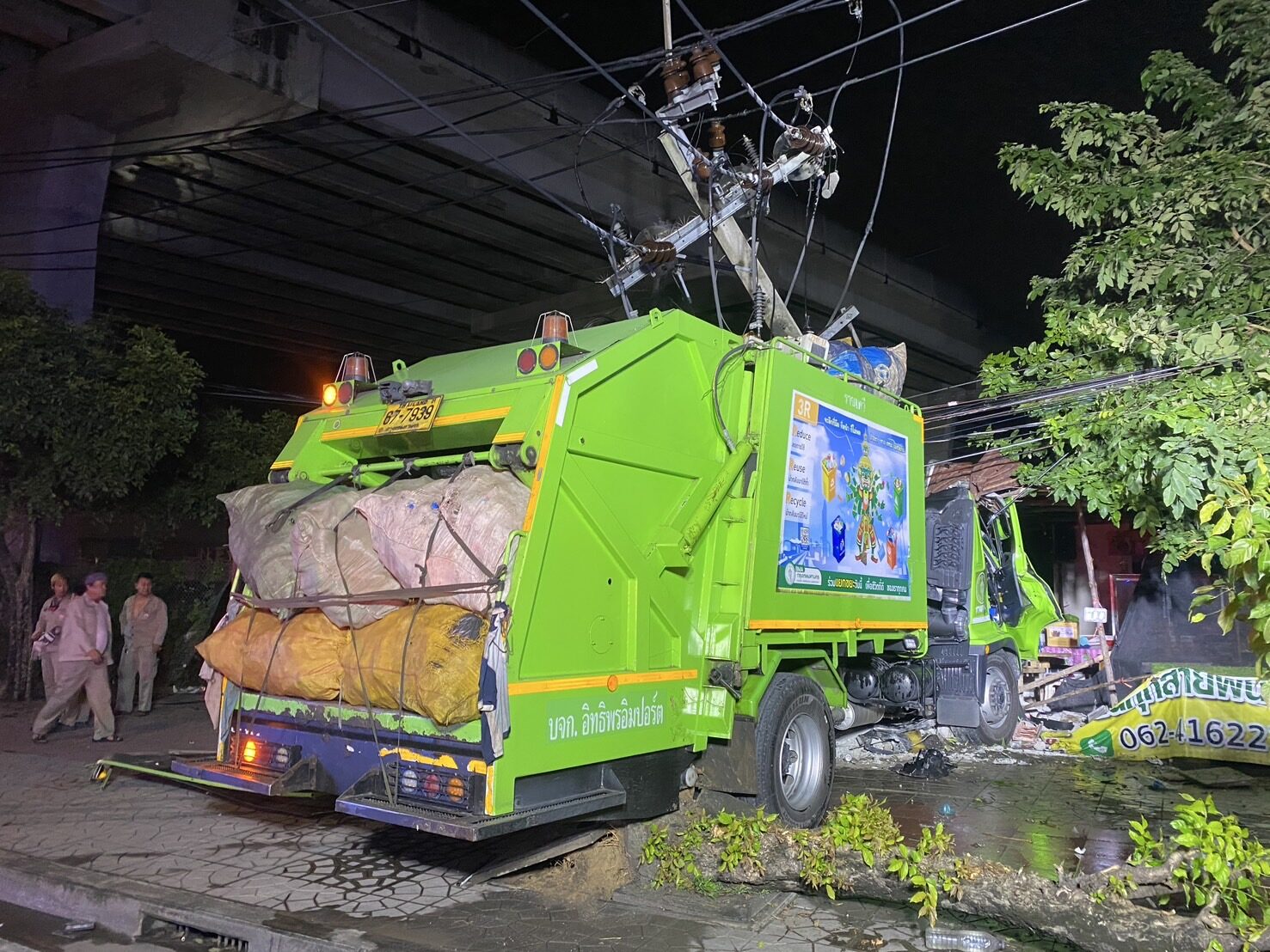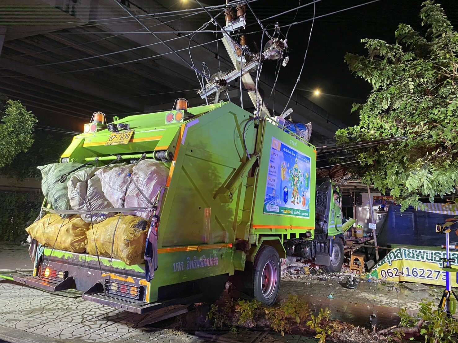 คนขับรถขยะ กทม. เอื้อมหยิบขวดน้ำเบาะหลัง ก่อนพุ่งชนยับ เสาไฟฟ้า ต้นไม้ ร้านข้างทาง