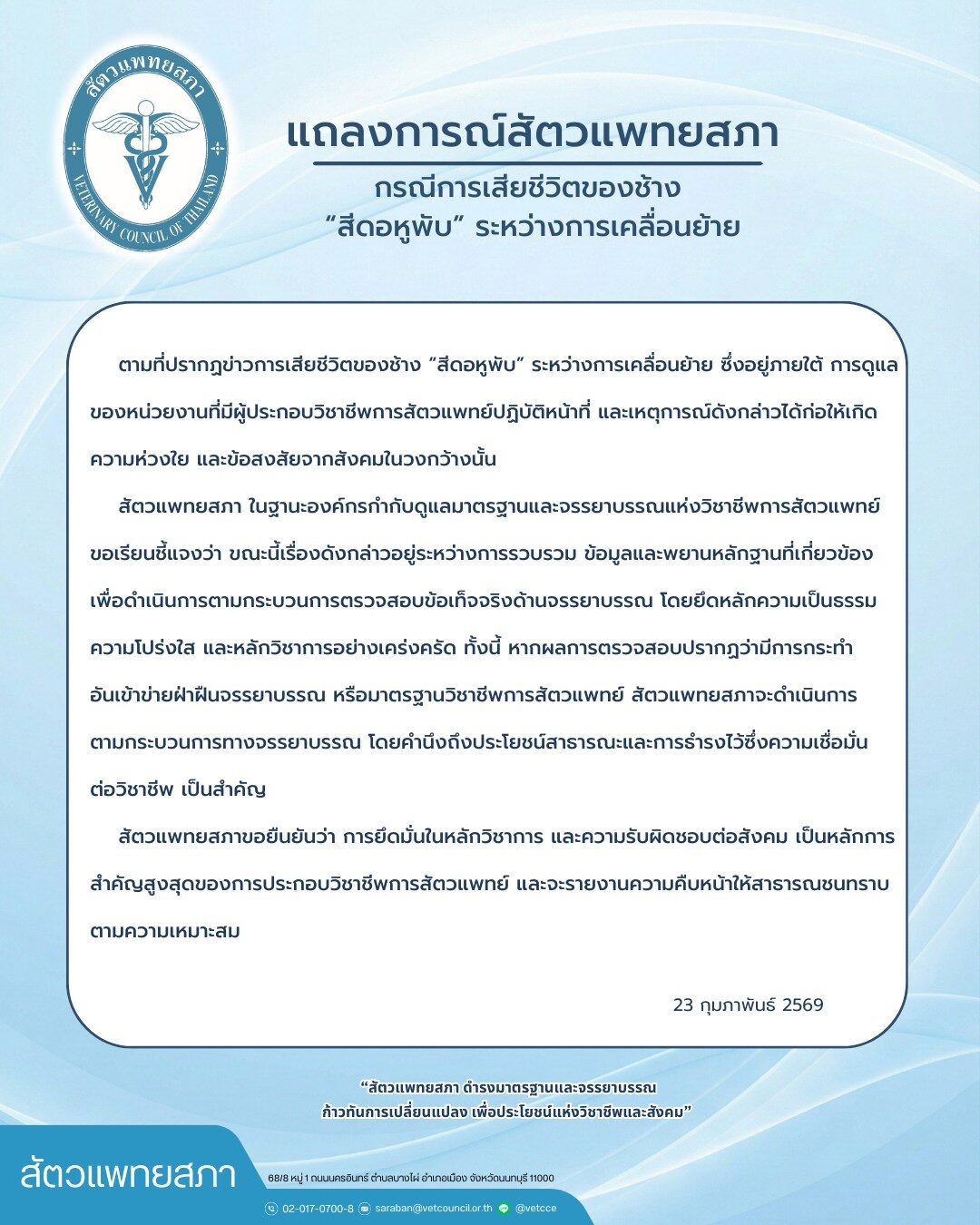วันที่ 23 ก.พ.2569 สัตวแพทยสภา ประเทศไทย ออกแถลงการณ์ กรณีการล้มของช้าง “สีดอหูพับ” ระหว่างการเคลื่อนย้าย ความว่า ตามที่ปรากฏข่าวการเสียชีวิตของช้าง “สีดอหูพับ” ระหว่างการเคลื่อนย้าย ซึ่งอยู่ภายใต้ การดูแลของหน่วยงานที่มีผู้ประกอบวิชาชีพการสัตวแพทย์ปฏิบัติหน้าที่ และเหตุการณ์ดังกล่าวได้ก่อให้เกิดความห่วงใย และข้อสงสัยจากสังคมในวงกว้างนั้น
