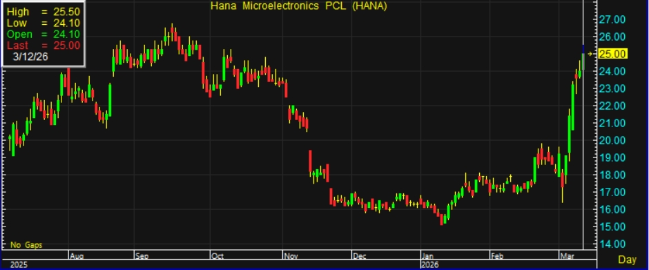 อัพเดต 12 มี.ค. เวลา 07.08 น. • เผยแพร่ 12 มี.ค. เวลา 04.34 น. • ข่าวหุ้นธุรกิจออนไลน์ผู้สื่อข่าวรายงานว่า วันนี้ (12 มี.ค. 69) ราคาหุ้น บริษัท ฮานา ไมโครอิเล็คโทรนิคส จำกัด (มหาชน) หรือ HANA ณ เวลา 11:30 น. อยู่ที่ระดับ 25.00 บาท บวก 1.00 บาท หรือ 0.73% สูงสุดที่ระดับ 25.50 บาท ต่ำสุดที่ระดับ 24.10 บาท ด้วยมูลค่าการซื้อขาย 882.30 ล้านบาท