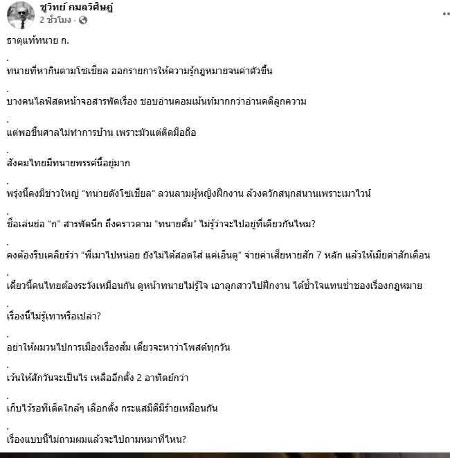 วันที่ 22 ม.ค.69นายชูวิทย์ กมลวิศิษฏ์ อดีตนักการเมืองชื่อดัง โพสต์ข้อความระบุว่า ธาตุแท้ทนาย ก. ทนายที่หากินตามโซเชียล ออกรายการให้ความรู้กฎหมายจนค่าตัวขึ้น บางคนไลฟ์สดหน้าจอสารพัดเรื่อง ชอบอ่านคอมเมนต์มากกว่าอ่านคดีลูกความ แต่พอขึ้นศาลไม่ทำการบ้าน เพราะมัวแต่ติดมือถือ สังคมไทยมีทนายพรรค์นี้อยู่มาก