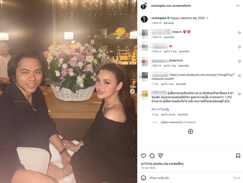 ขณะที่ นนนี่ ภรรยา โพสต์ภาพหวานอยู่กับสามีเมื่อช่วงวาเลนไทน์ที่ผ่านมากับดอกไม้กระเช้าใหญ่สุดโรแมนติก พร้อมแคปชั่นว่า Happy valentine day 2026