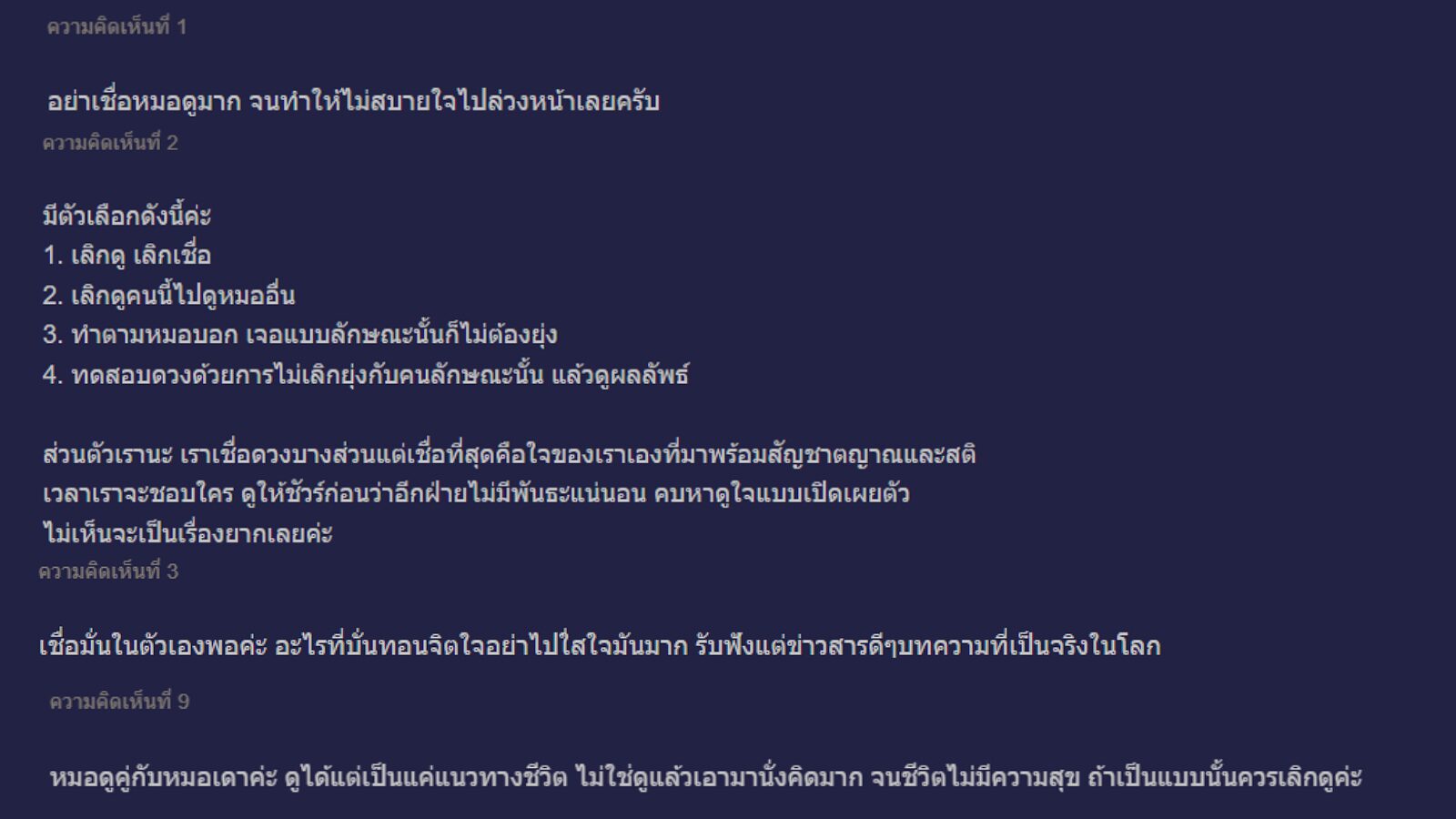 ด้านความคิดเห็นชาวเน็ต แนะนำว่าอย่าเชื่อหมอดูมากเกินไปจนทำให้ตัวเองไม่สบายใจ หากให้เสนอทางเลือก หลายคนแนะว่าให้ไปหาหมอดูคนอื่น หรือลองทดสอบว่าแม่นจริงไหม หากเจอคนลักษณะแบบที่หมอดูทักก็ลองคบแล้วดูผลลัพธ์ ทั้งนี้ ไม่ควรยึดติดดวงและคำทำนายมากนัก สิ่งที่สำคัญเวลาคบใครคือสติและใจของเรา