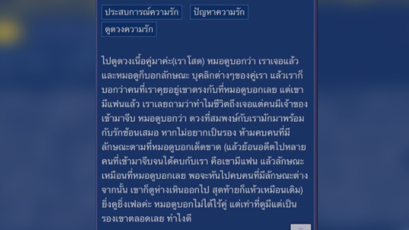 เมื่อวันที่ 5 ก.พ. 66 สมาชิกหมายเลข 4823744 ได้ตั้งกระทู้ปรึกษาปัญหาความรัก โดยเล่าว่า เธอไปดูดวงมา หมอดูทำนายว่า เธอเจอเนื้อคู่แล้ว พร้อมบอกลักษณะของเนื้อคู่ให้ฟัง ซึ่งลักษณะตรงกับคนที่เธอกำลังคุยอยู่ แต่เขามีแฟนแล้ว เธอจึงบอกเรื่องนี้กับหมอดู พร้อมถามว่าทำไมถึงเจอแต่คนมีเจ้าของเข้ามาจีบ