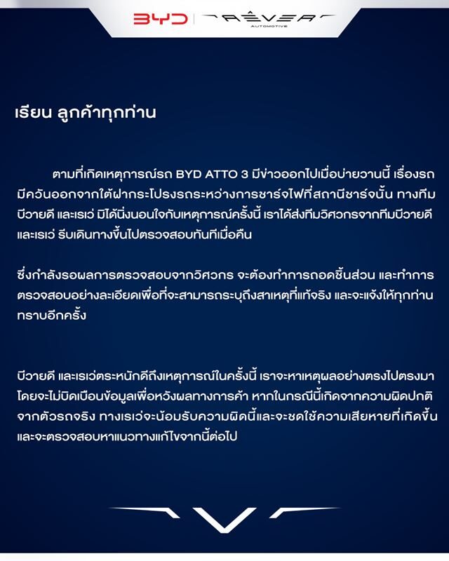 โดยเพจ BYD RÊVER Thailand ได้ชี้แจงถึงกรณีดังกล่าวว่า "ตามที่เกิดเหตุการณ์รถ BYD ATTO 3 มีข่าวออกไปเมื่อบ่ายวานนี้ เรื่องรถมีควันออกจากใต้ฝากระโปรงรถระหว่างการชาร์จไฟที่สถานีชาร์จนั้น ทางทีมบีวายดี และเรเว่ มิได้นิ่งนอนใจกับเหตุการณ์ครั้งนี้ เราได้ส่งทีมวิศวกรจากทีมบีวายดีและเรเว่ รีบเดินทางขึ้นไปตรวจสอบทันทีเมื่อคืน ซึ่งกำลังรอผลการตรวจสอบจากวิศวกร จะต้องทำการถอดชิ้นส่วน และ ทำการตรวจสอบอย่างละเอียดเพื่อที่จะสามารถระบุถึงสาเหตุที่แท้จริง และจะ แจ้งให้ทุกท่านทราบอีกครั้ง