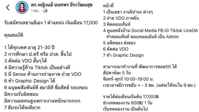 - หญิงแย้ เปิดรับสมัครเลขา เงินเดือน 1.7 หมื่น อึ้งหน้าที่เกินค่าจ้าง เจ้าตัวแจง
