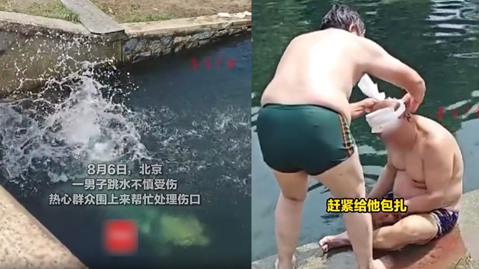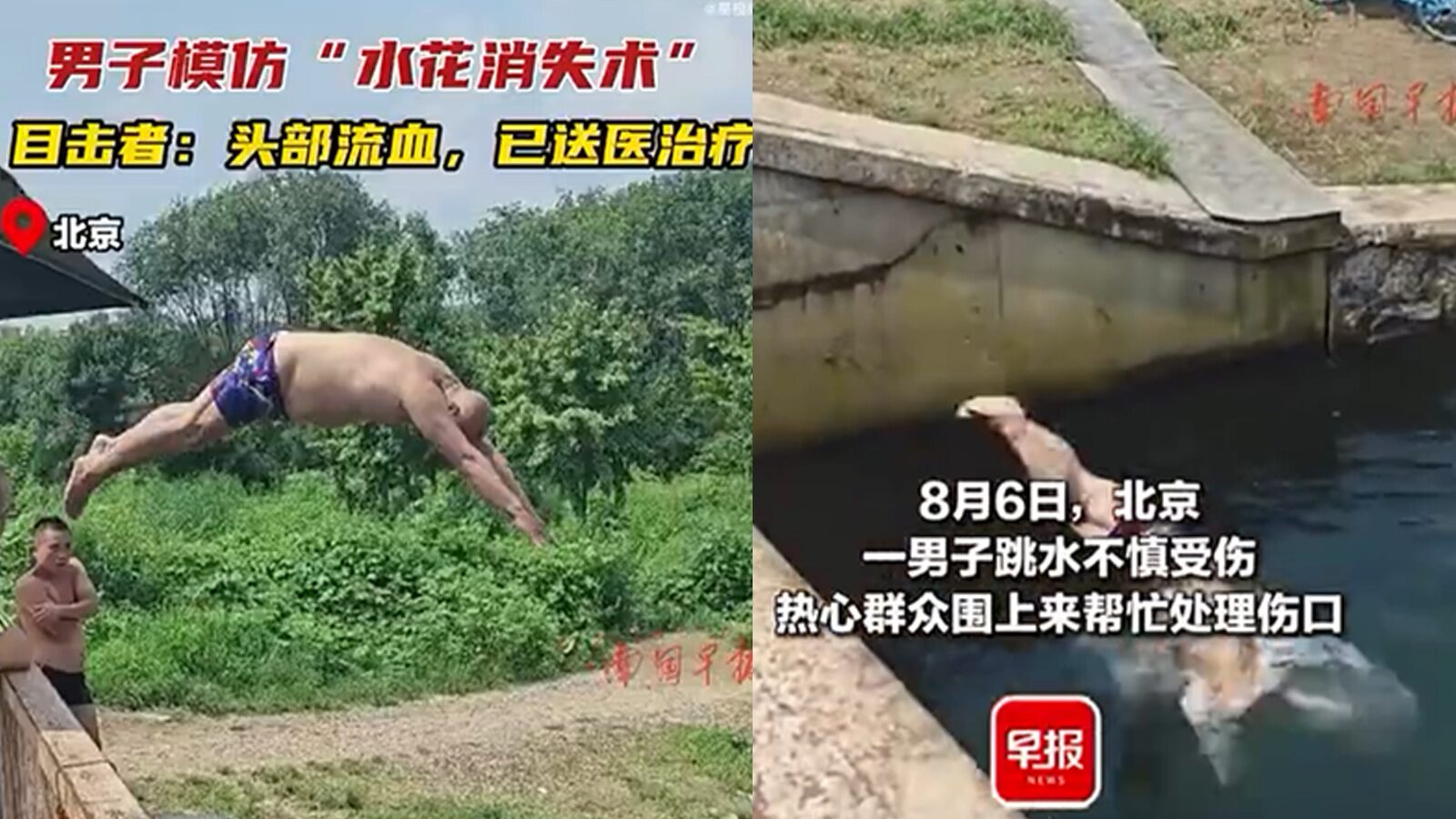 ตามรายงานของสื่อจีน เมื่อวันที่ 6 สิงหาคม ชายคนหนึ่งในกรุงปักกิ่งได้ทำการกระโดดน้ำเลียนแบบนักกีฬา ทั้งนี้สถานที่กระโดดน้ำนั้นไม่ใช่สระว่ายน้ำ แต่เป็นเพียงคลองเล็กๆ เมื่อกระโดดลงไปจึงทำให้หัวกระแทกน้ำโดยตรง