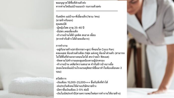 อ่านข่าวต้นฉบับได้ที่ : ฮือฮา 'รับสมัครแม่บ้าน' เงินเดือน 25,000 บาทต่อเดือน เห็นที่พักแล้วตาลุก