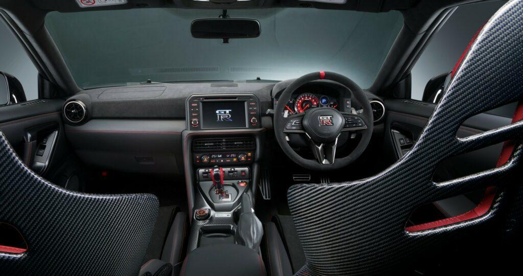 ภายในคงเดิมแต่ปรับในส่วนโทนสีโดยเฉพาะรุ่น GT-R NISMO ได้เบาะนั่งแบบบัคเก็ตซีทตกแต่งลายคาร์บอนใหม่จาก Recaro นอกนั้นคงเดิมตั้งแต่แผงคอนโซลหน้าออกแบบให้เชื่อมต่อกันกับแนวเส้นบนที่ยาวต่อเนื่องจนถึงแผงคอนโซลกลางระบบนำทางในชุดจอสัมผัส 8 นิ้ว แบบ Display Command Console ติดตั้งอยู่ตรงแผงคอนโซลกลาง พร้อมลำโพงคุณภาพ BOSE มากถึง 11 จุด และลดจำนวนสวิตช์เหลือเพียง 11 ปุ่ม เพื่อการใช้งานที่สะดวกขึ้น พร้อมการตกแต่งเบาะนั่งหนังแท้ที่ต่างกันเข่นเบาะนั่งหุ้มด้วยหนังกลับ ภายในหลังคาใช้วัสดุ Alcantara และสัญลักษณ์ T-spec บริเวณคอนโซล รุ่น Premium ใช้หนัง Nappa Leather ชั้นดี ตัดเย็บด้วยความประณีต โดยมีโทนสีให้เลือกถึง 3 สีทั้ง สีเทา Urban Grey สีแดง Amber Red และ สีดำ Samurai Black