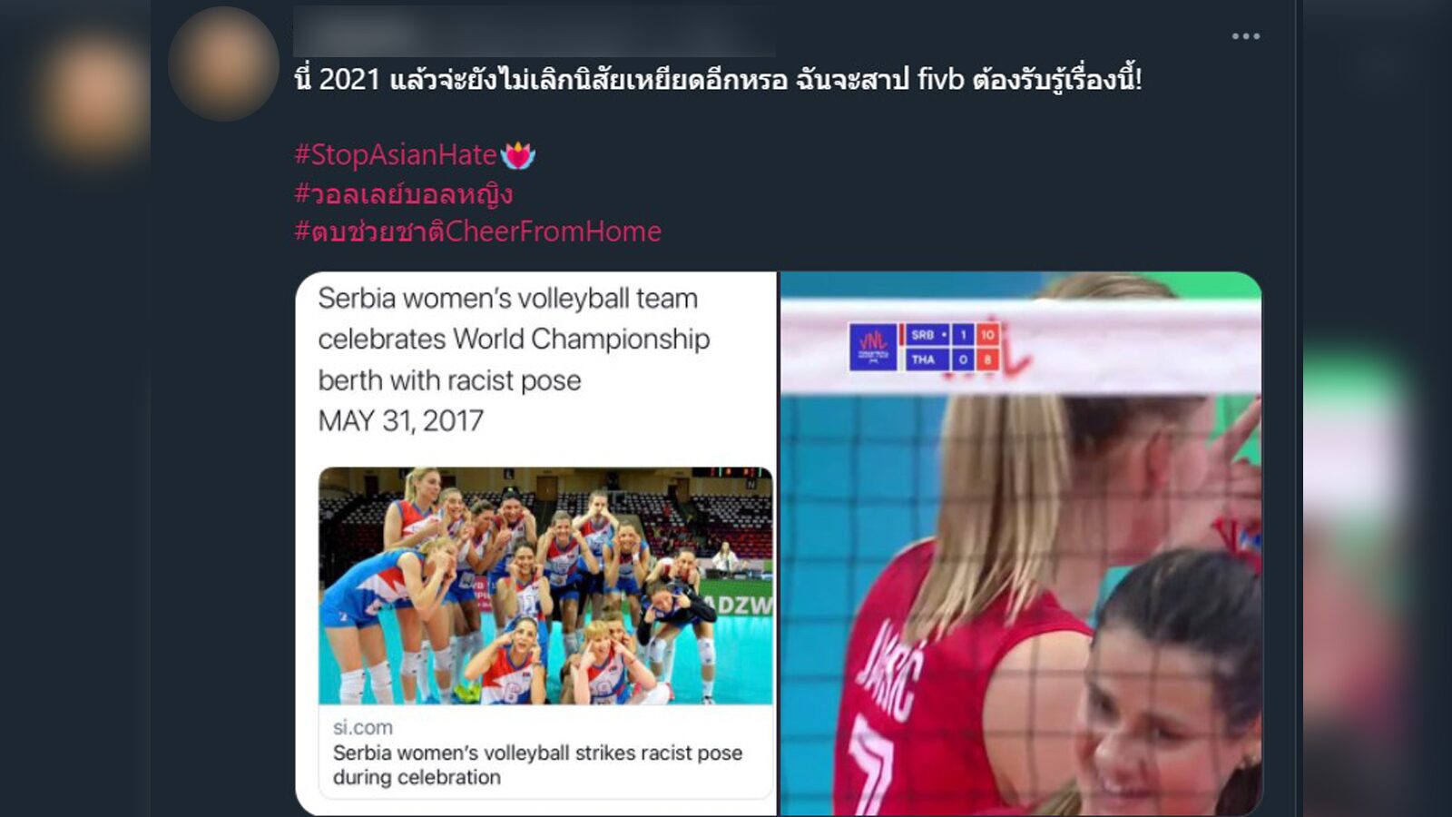 กลายเป็นดราม่าระอุโซเชียล หลัง "ยูร์เยวิช ซานญา" ผู้เล่นเซอร์เบียได้ทำ "Fox eyes" ท่าทางที่ส่อไปถึงการเหยียดเชื้อชาติชาวเอเชีย คล้ายกับกำลังล้อเลียนผู้เล่นไทย ในนัดที่เซอร์เบียเจอกับไทย ในช่วงค่ำวานนี้ (1 มิถุนายน 2564)