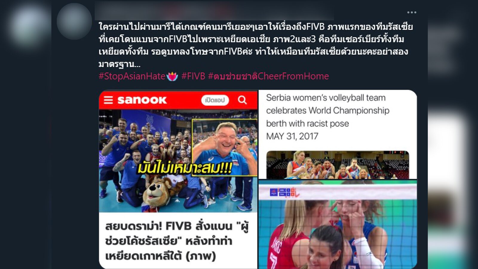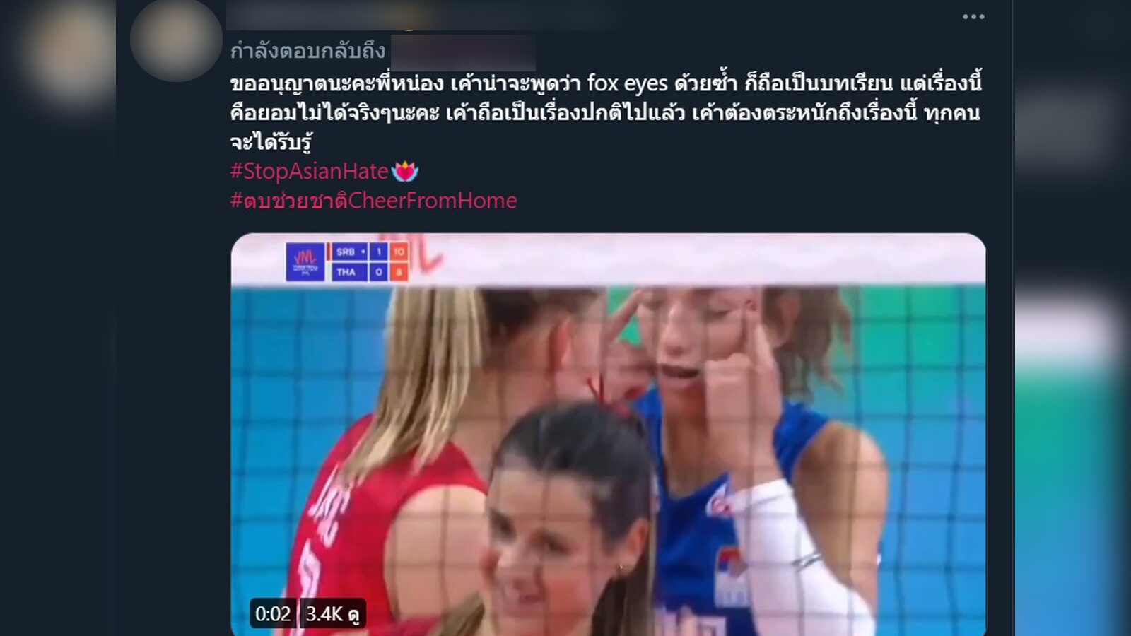 จากข้อความข้างต้น ชาวเน็ตมองว่า ปัจจุบันมีการตระหนักในเรื่องการเหยียดเชื้อชาติมากขึ้น มีการรณรงค์ความเท่าเทียมกันของมนุษย์กันทั่วโลก เหตุใดผู้เล่นเซอร์เบียยังทำท่าทีส่อถึงการเหยียดเชื้อชาติอยู่ จึงอยากให้ทางสหพันธ์วอลเลย์บอลนานาชาติออกบทลงโทษ เพื่อเป็นตัวอย่างจะได้ไม่เกิดเหตุการณ์เช่นนี้อีก