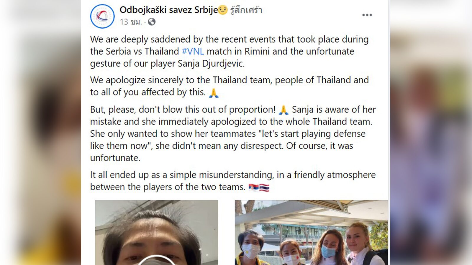 ต่อมาทาง "ปลื้มจิตร์ ถินขาว" นักกีฬาวอลเลย์บอลสาวไทยได้โพสต์คลิปบนเฟซบุ๊คส่วนตัวว่า ยูร์เยวิช ซานญา ผู้เล่นเซอร์เบียได้เข้ามาขอโทษแล้ว และชี้แจงว่าไม่ได้ตั้งใจเหยียดเชื้อชาติแต่อย่างใด จากนั้นไม่นานทางสหพันธ์วอลเลย์บอลเซอร์เบีย ก็ออกแถลงการณ์ขอโทษทีมไทยเช่นกัน