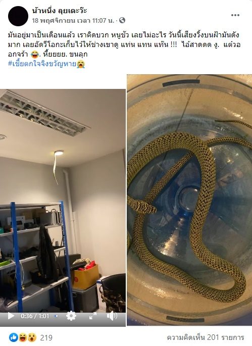 เป็นคลิปที่เห็นแล้วขนลุกแทน เมื่อสมาชิกเฟซบุ๊ก น้าหนึ่ง ลุยเดะว๊ะ ได้โพสต์คลิปที่กำลังถ่ายฝ้าเพดาน ซึ่งเขาระบุว่า ได้ยินเสียงอะไรบางอย่างมาสักพัก เลยถ่ายคลิปเพื่อจะดูว่าเป็นเสียงอะไร แต่ขณะที่กำลังถ่ายคลิปอยู่ งูก็โผล่ออกมาจากฝ้าทันที