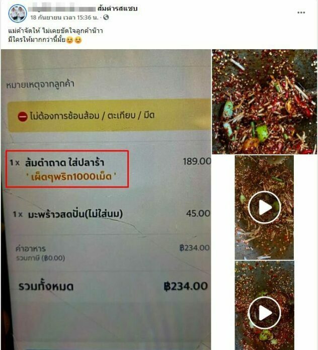 จากกรณีโลกออนไลน์เผยแพร่เรื่องราวบนกลุ่มส้มตำแซบๆ ที่มีสมาชิกถึง 3 แสนคน โดยโชว์ออเดอร์ของลูกค้าที่ระบุว่า ส้มตำถาด ใส่ปลาร้า เผ็ดๆ พริก 1,000 เม็ด พร้อมระบุว่า “แม่ค้าจัดให้ ไม่เคยขัดใจลูกค้าน๊าา มีใครให้มากกว่านี้มั้ย” ก่อนมาคอมเมนต์ในภายหลังด้วยความท้อใจ เพราะถูกลูกค้ากดลดดาว และเขียนคอมเมนต์ให้ร้านว่า “พริกไม่ถึง1,000 เม็ด” ตามที่เสนอข่าวไปแล้วนั้น