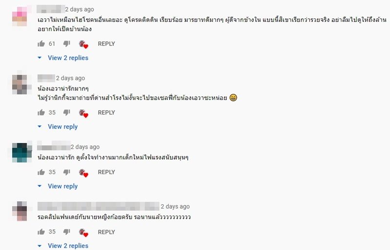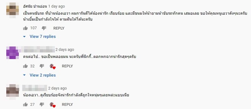 โดยมีคนระบุเป็นคนขับรถที่บ้านเอวา เข้ามาคอมเมนต์ด้วยว่า “เป็นคนขับรถ ที่บ้านน้องเอวา ผมการันตีได้น้องน่ารัก เรียบร้อย และมีขนมให้น้ายามน้าขับรถทุกคน เสมอเลย ขอให้คุณหนูเอวาดังๆนะครับ น้าเบิ้มเป็นกําลังใจให้ ตามฝันให้ได้นะครับ”